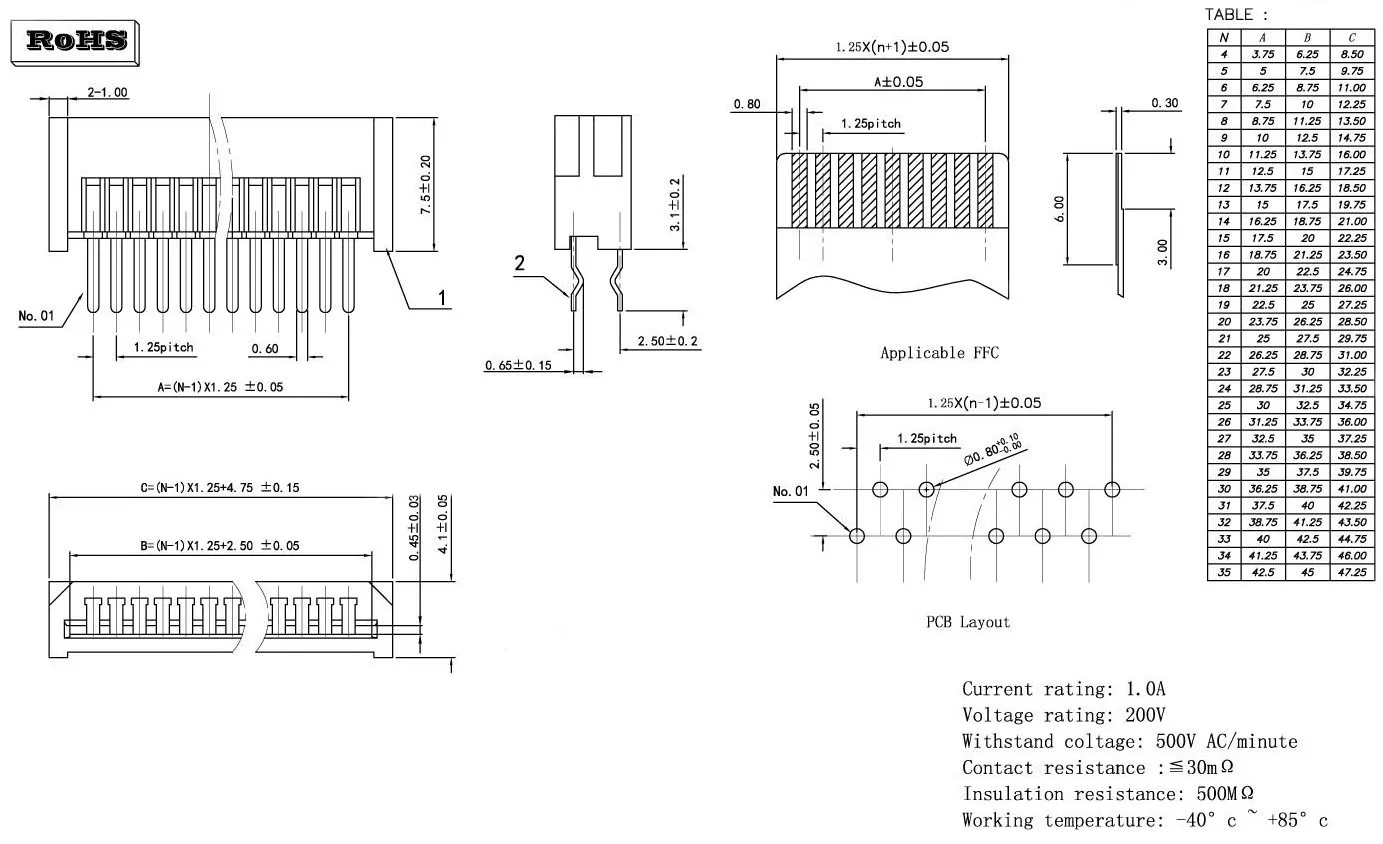 FPC FFC 1.25mm 4/6/7/8/9/10/11/12/13/14/15/16/18/20/21/22/23/24/26/28/30/32 Pin Dual Contact Straight Cable Connector