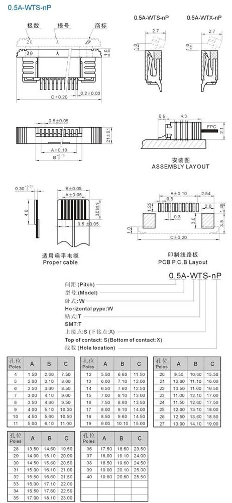 FPC FFC 0.5mm Pitch 50 54 60 Pin Drawer Flat Cable Connector Socket Top / Bottom Contacts