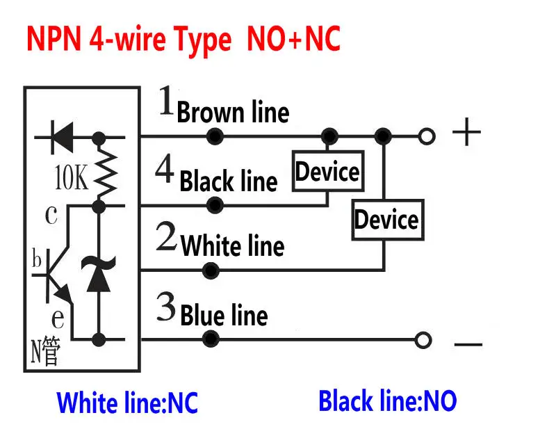 LJ12A3-4-Z/CX: NPN NO+NC 4-Line DC type 12mm diameter ; 4mm detection distance