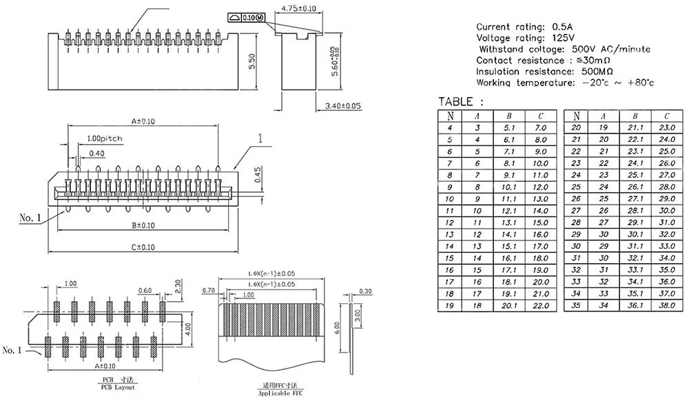 SMT FPC FFC Flat Cable Connector 1.0mm Pitch 4 5 6 7 8 9 10 12 14 16 18 20 22 24 26 28 30 Pin Dual Contacts